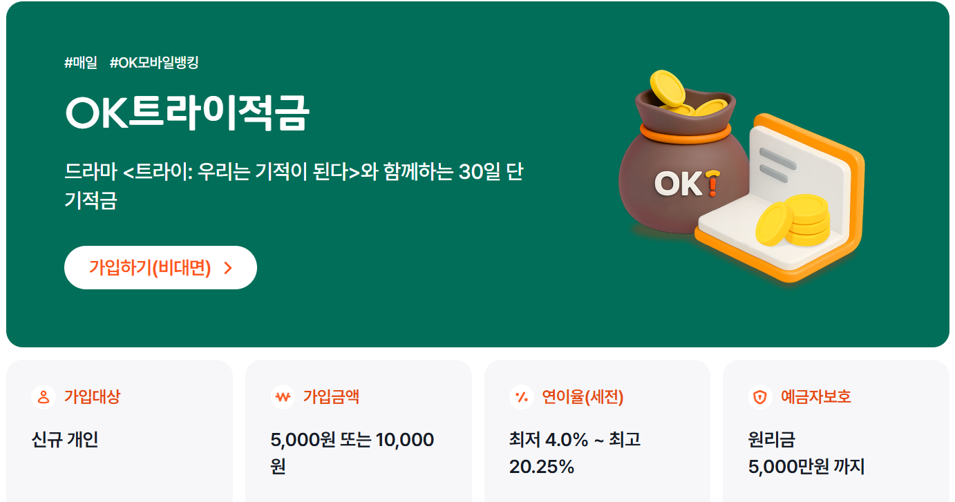 OK트라이적금은 8월 중순 경에 OK저축은행이 새로 선보인 상품으로, 드라마 '트라이: 우리는 기적이 된다'와 콜라보해서 출시한 적금입니다.