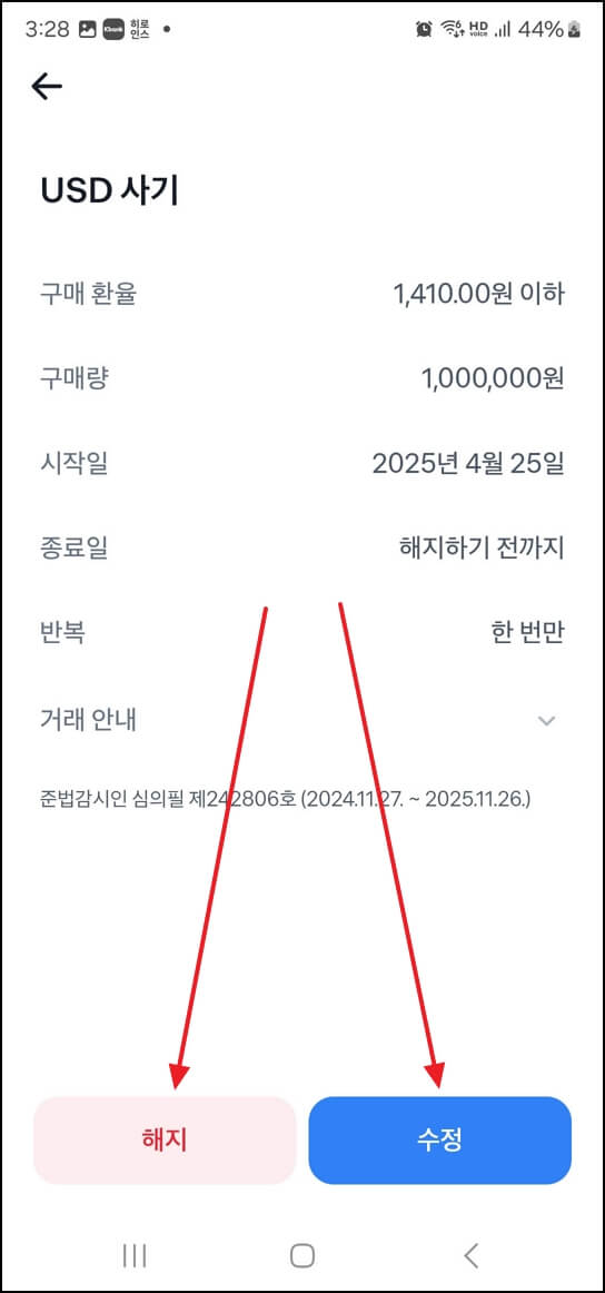 '원하는 환율에 환전하기' → '미국 달러' 선택 → USD 사기 클릭 → 해지 혹은 수정 클릭