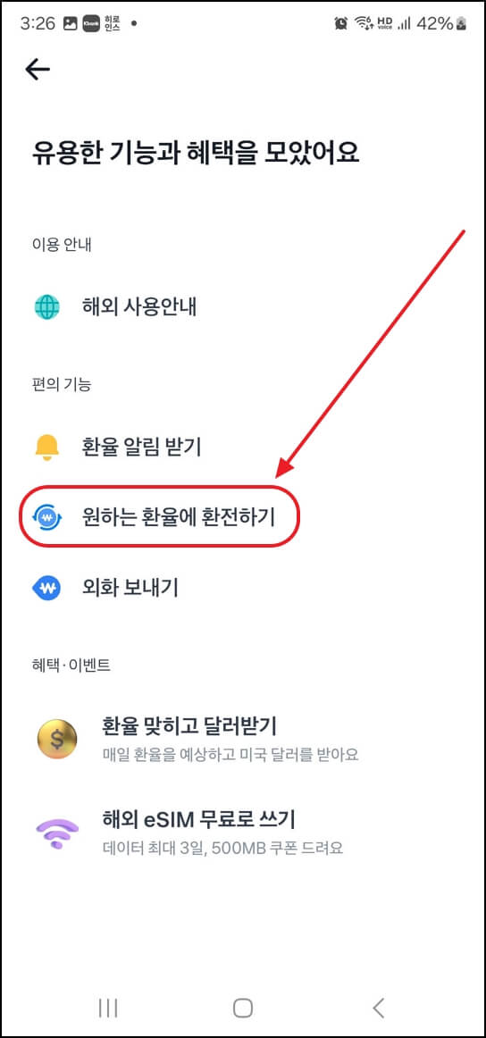 외화 통장을 클릭해서 들어간 후, '미국 달러'를 클릭합니다. '혜택·이용 안내' →원하는 환율에 환전하기를 클릭해서 달러를 선택해 주세요.
