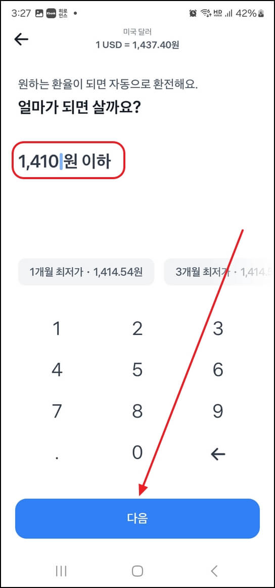 원하는 환율에 USD 사기 옆에 보이는 '추가하기'를 클릭합니다. 원하는 환율을 입력해 주세요. 저는 1410원으로 하겠습니다. 이제 다음을 눌러 주세요.