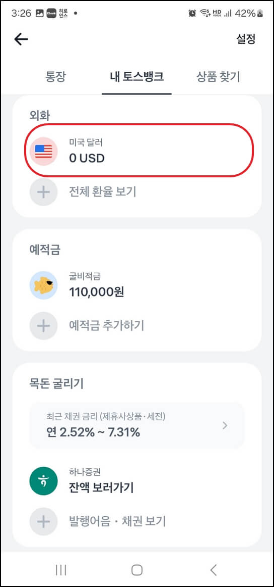 우선, 토스앱을 열어서 외화통장으로 들어가 주세요. 혹시 외화통장이 안 보인다면, 아래 사진에 보이는 '계좌'를 클릭하시면 됩니다.